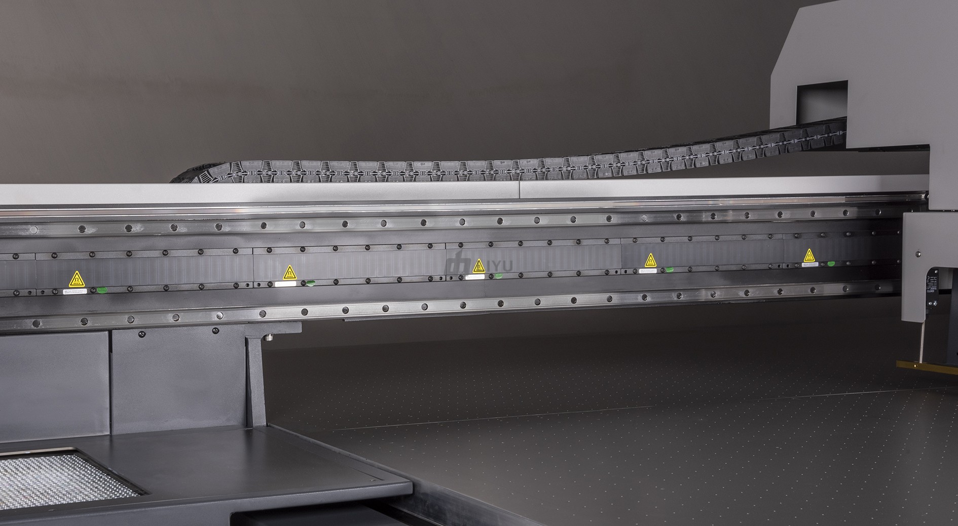 El sistema de vacío de 4 a 8 zonas, junto con los sensores de colisión y seguridad, mejora la eficiencia del flujo de trabajo manteniendo altos estándares de seguridad. Con una resolución máxima de 2400 dpi y la capacidad de imprimir materiales de hasta 100 mm de altura, puede realizar impresiones detalladas sobre una amplia variedad de superficies.
