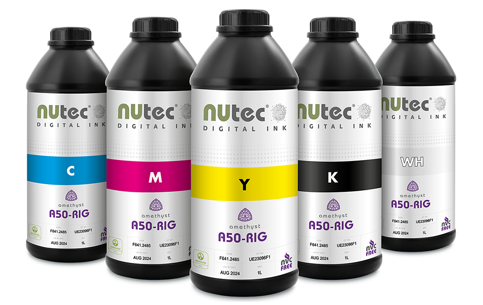 Amethyst A50-RIG es una tinta UV curable de alta calidad diseñada específicamente para aplicaciones sobre sustratos rígidos. Formulación premium con certificación GREENGUARD Gold que garantiza bajas emisiones de VOC, ideal para ambientes interiores sensibles.